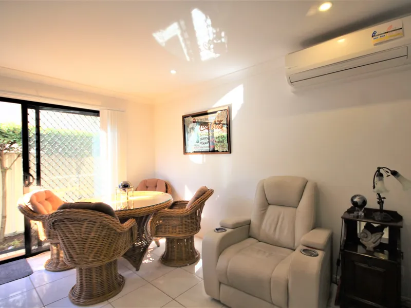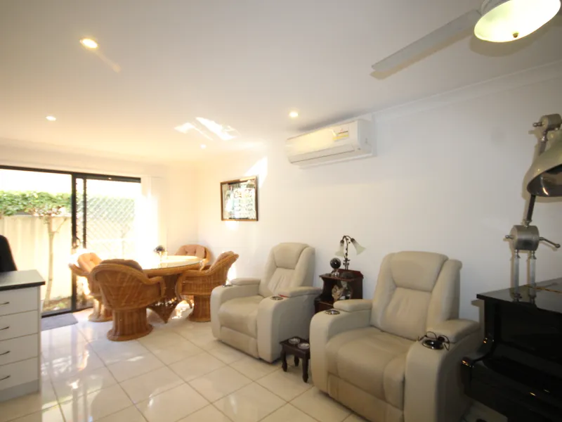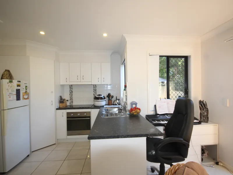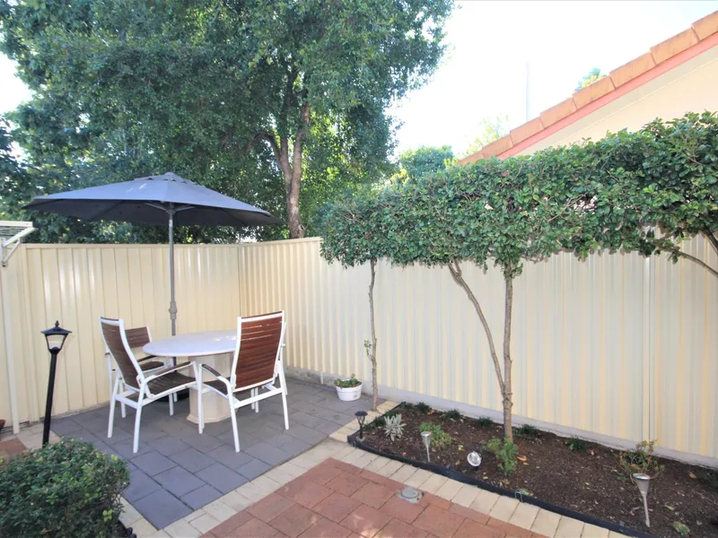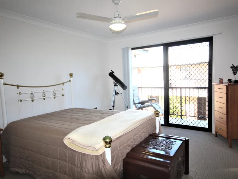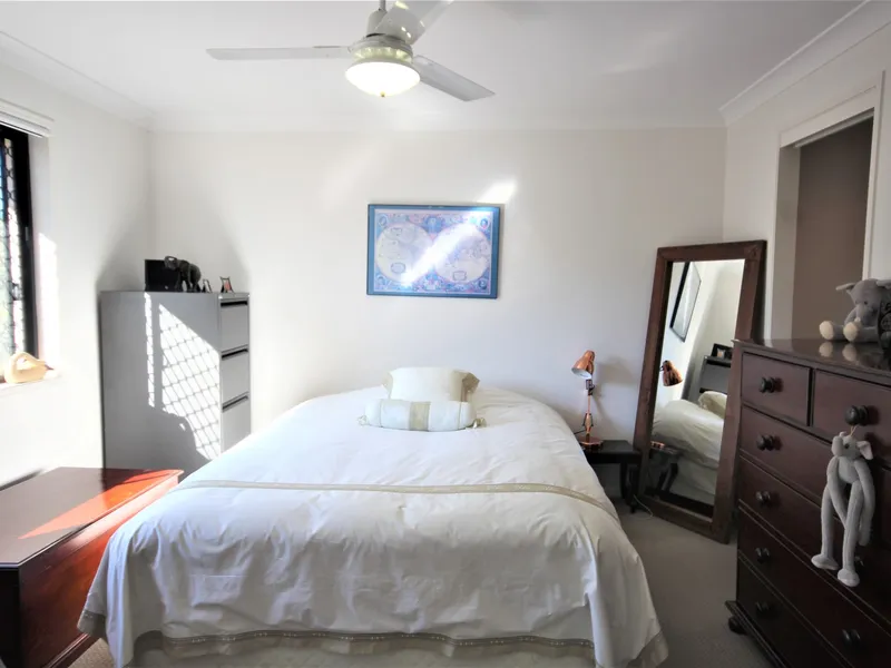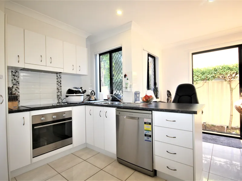This modern townhouse is well-kept and located at the quiet end of a small complex and comes with security screens throughout. Upstairs features two large bedrooms (see dimensions below), each with their own bathrooms, walk in robes and ceiling fans. The Master bedroom boasts a balcony with a pleasant outlook and in the hallway between the bedrooms there is space for a study nook. One of the bathrooms is two way and has a shower over bath. Downstairs is an open plan design flowing from the kitchen through to the air-conditioned dining and living areas. Included on the ground floor is an internal laundry and extra toilet. At the rear of the property is your very own paved courtyard with easy care gardens, water tanks and side access. There is single remote lock up garage with storage shelving and internal access.