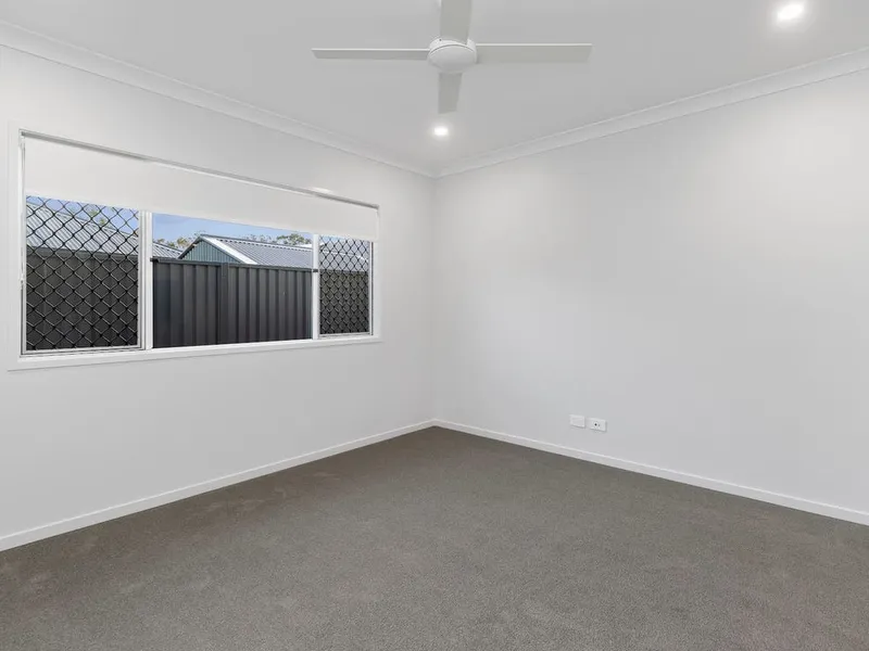 The master bedroom, featuring air-conditioning, ceiling fan and a generous walk-in wardrobe and. Three additional bedrooms all include built-in wardrobes, ceiling fans, and soft carpeting, with a separate bathroom and toilet. A separate laundry adds practicality and storage.