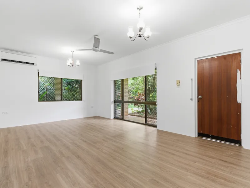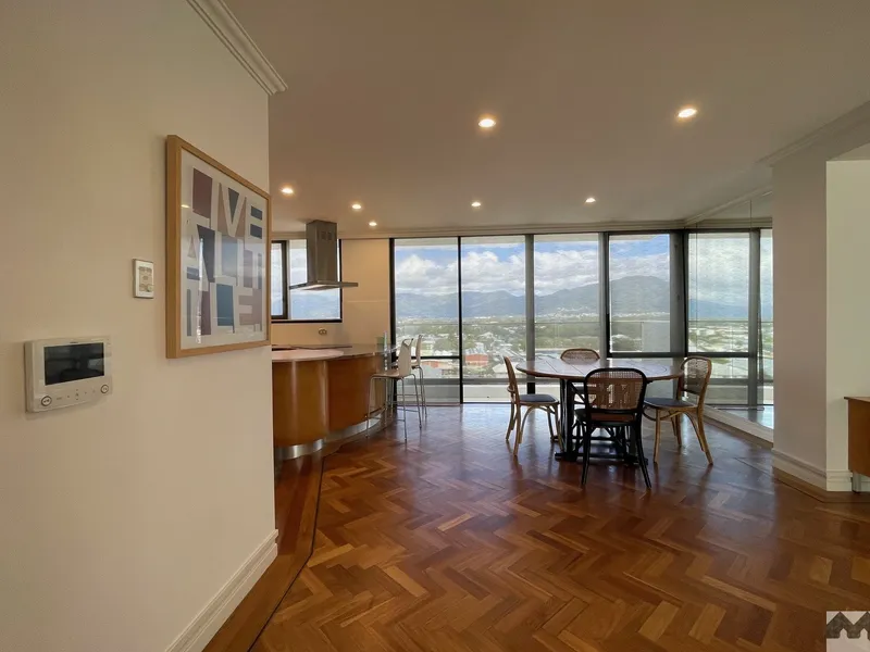 Living areas are on the lower level and feature views of the mountains to the West and the waterfront to the East with elegant parquetry flooring, flowing seamlessly to the expansive main balcony, offering a breathtaking outlook across Trinity Inlet and the Coral Sea, stretching as far as Green Island.