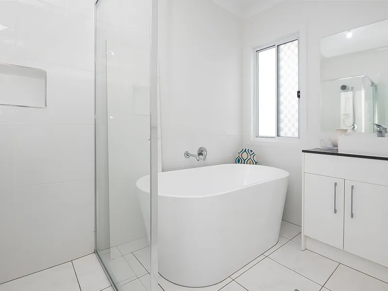 All five bedrooms are generously sized and include built-in wardrobes and ceiling fans. The master bedroom is complete with its own private ensuite, while the main bathroom is finished with modern fittings and includes a separate shower and bathtub.