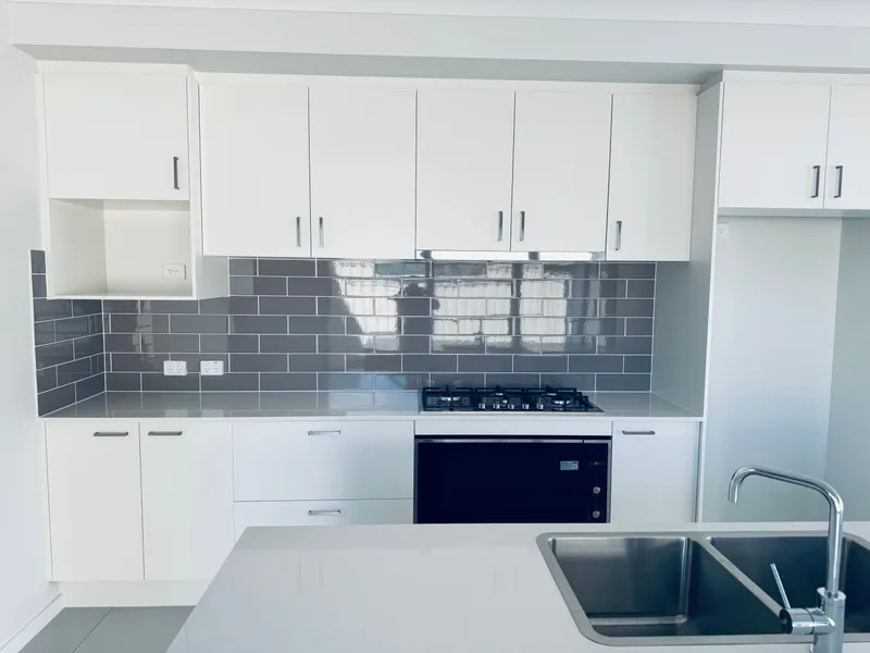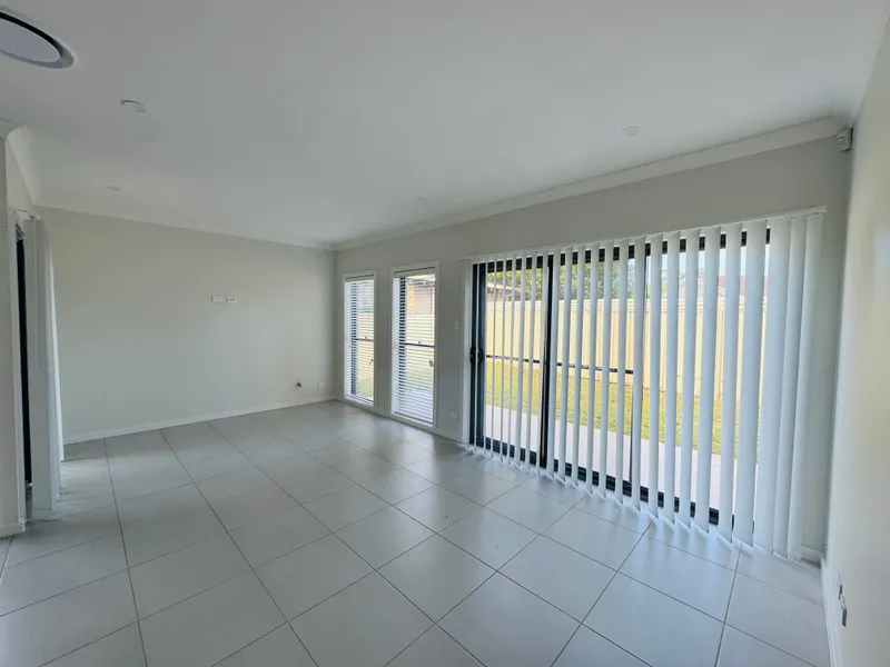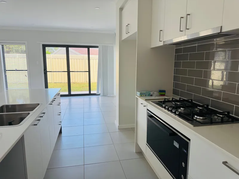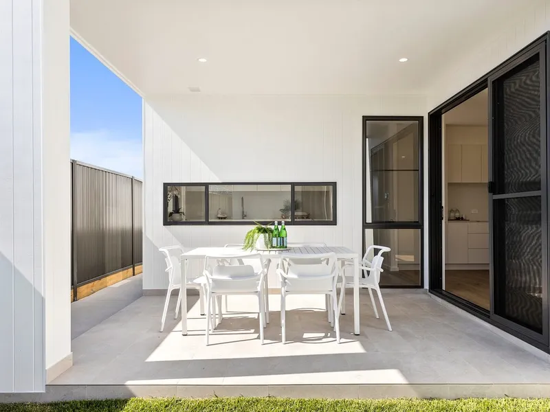 Step inside to a beautifully designed open-plan living space, featuring a high-end kitchen with a waterfall stone island, sleek white cabinetry, herringbone splashback, and statement pendant lighting. The light-filled living and dining areas flow seamlessly to a covered alfresco—ideal for entertaining—overlooking a low-maintenance yard. Ducted air conditioning and neutral tones throughout ensure year-round comfort and style.