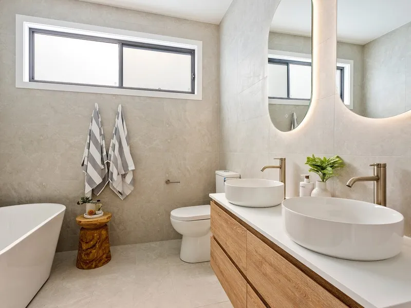 The home offers four spacious bedrooms, including a peaceful master retreat complete with a walk-through robe and a stylish ensuite. The main bathroom is equally impressive, showcasing twin vanities, arched backlit mirrors, and a luxurious freestanding bath.