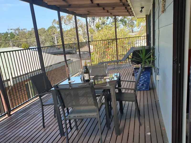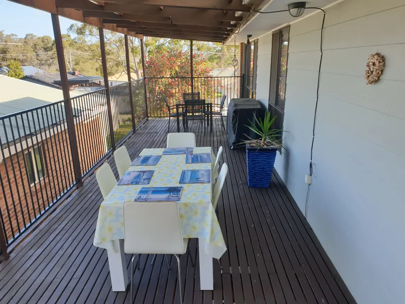 Step outside to the large covered balcony, perfect for outdoor dining and relaxation. It comes equipped with a BBQ, dining tables, and chairs, making it an ideal spot for meals or unwinding with a drink.