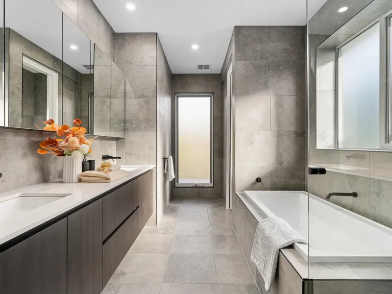 Accommodation is thoughtfully designed for comfort and privacy. A ground floor guest bedroom with walk-in robe and fully tiled ensuite provides excellent flexibility for extended family or visitors, while upstairs the spacious master suite features a sizeable walk-in robe and a luxurious dual-vanity ensuite. Each of the four bedrooms is complemented by its own private ensuite, offering exceptional convenience for modern family living. Two generous living zones provide plenty of space for relaxation and entertaining, while a separate powder room adds extra practicality for guests.