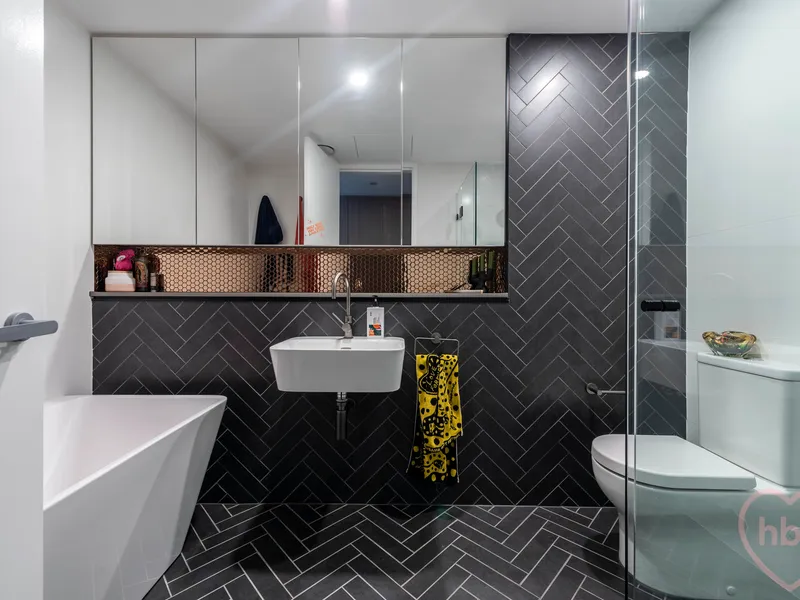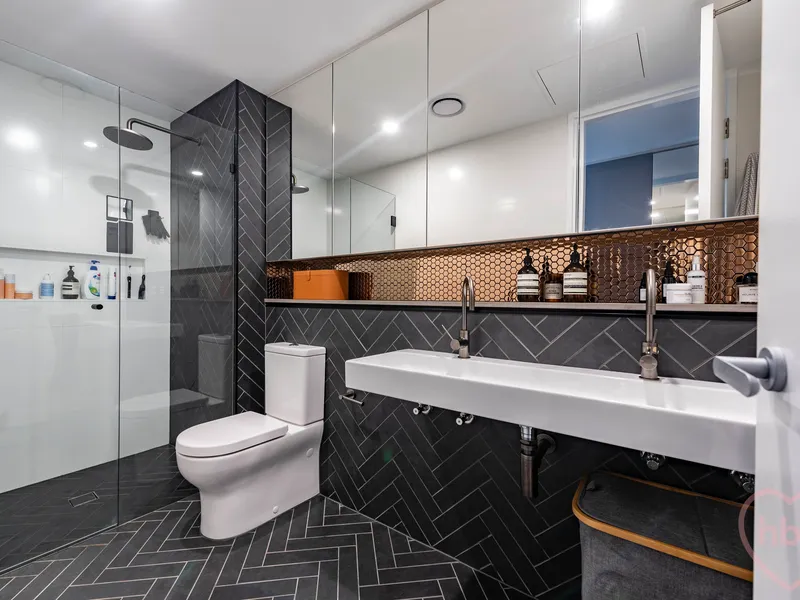 We love the reflective surfaces from the golden honeycomb tiling to the dark mirrored splashback, and the herringbone tiled bathroom floors, echoed in the breakfast bar detailing. The blue-grey tones in the bedrooms are in keeping with the natural feel, all with built in wardrobes. The master wing is privately sequestered on the opposing side drifting to the balcony. Cabinetry keeps things seamless within the entrance of the room and the ensuite is pure luxury. Twin basins and rain shower floating in a sea of gorgeous black herringbone tiling.