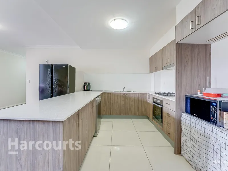The open-plan living and dining area is generous in size and flows seamlessly onto a large balcony, creating a perfect space for relaxing or entertaining. The functional kitchen features large stone benchtops, stainless steel appliances, and plenty of cupboard space for convenient everyday living.