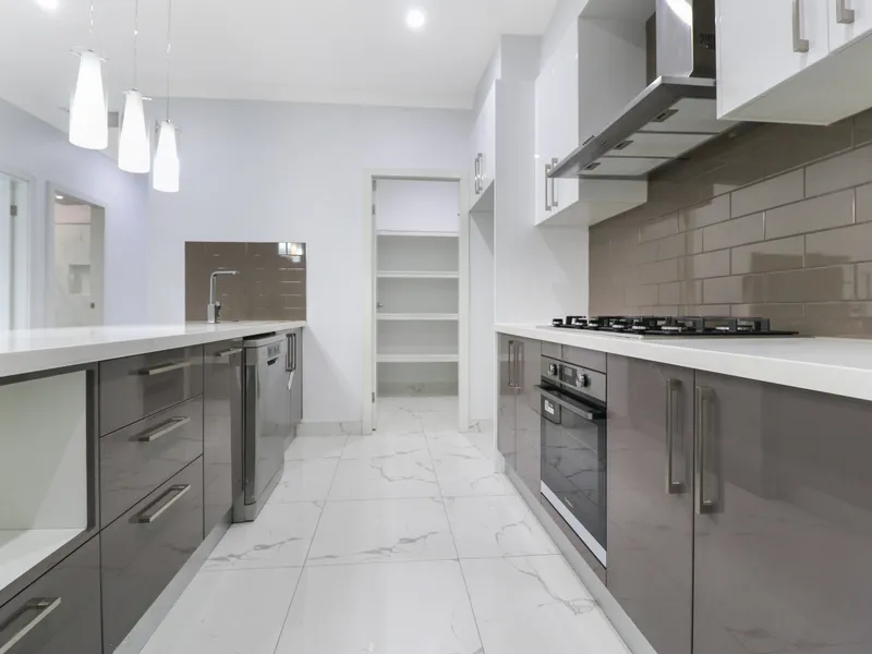 - Ultra modern kitchen with ceasarstone benchtops & stainless steel appliances including dishwasher