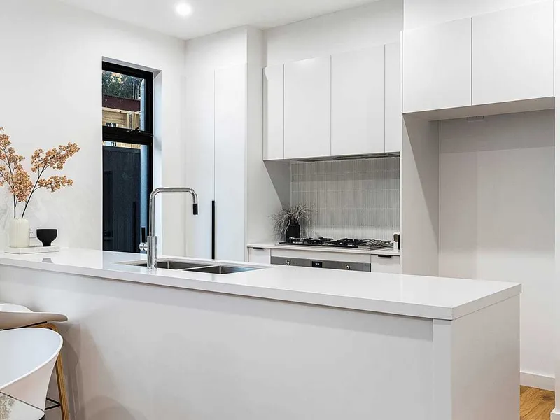 A stunning modern kitchen provides the best of contemporary amenities including 40mm composite stone bench tops, recessed double sink, 900mm wide Smeg oven cooktop, sleek white cabinetry and generous pantry space.