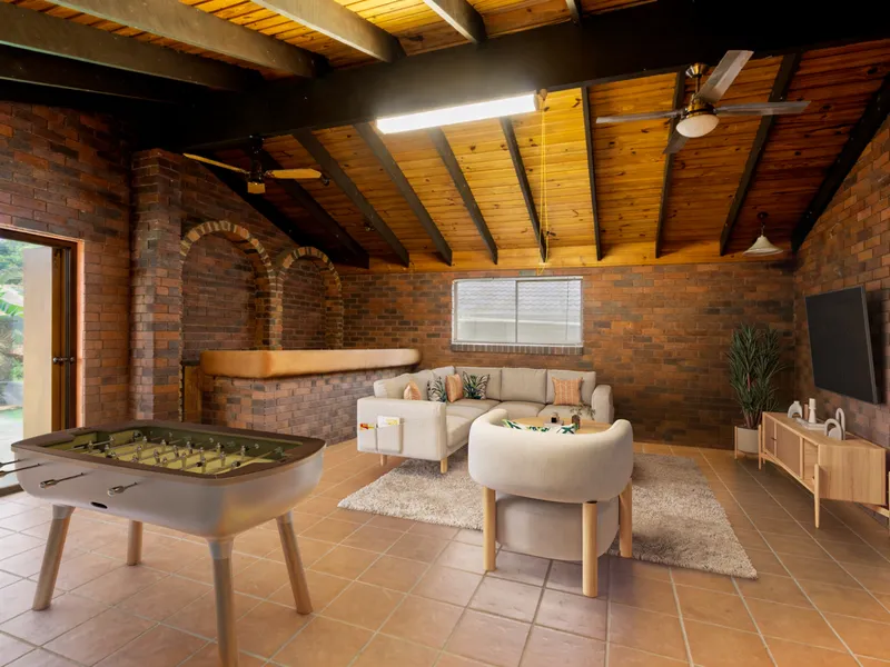 - Expansive separate second living area connected to the main house via a covered breezeway, features a high racked ceiling