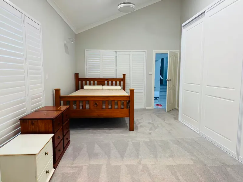 • Huge built-in wardrobe (heaps of storage), comfy wooden bed, bedside tables, plus a little cozy corner perfect for reading or chilling.