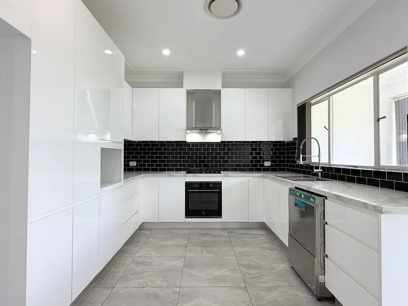 • Caesarstone kitchen featuring commercial-grade dishwasher, gas cooktop, stylish stone benchtops and ample cabinetry