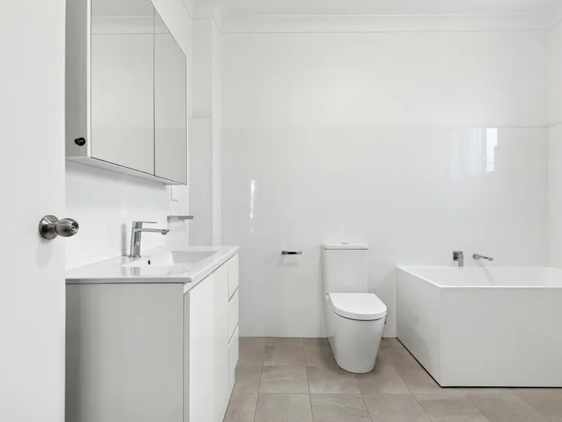 - Bright, airy bathroom with floor-to-ceiling tiles.