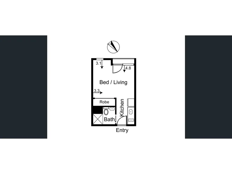 Smart open plan design living/bedroom, modern kitchen and central bathroom.