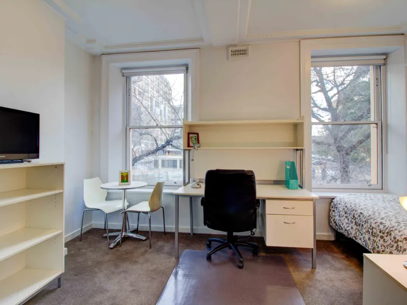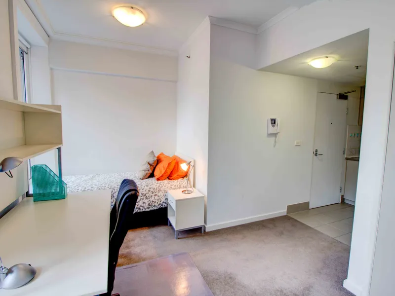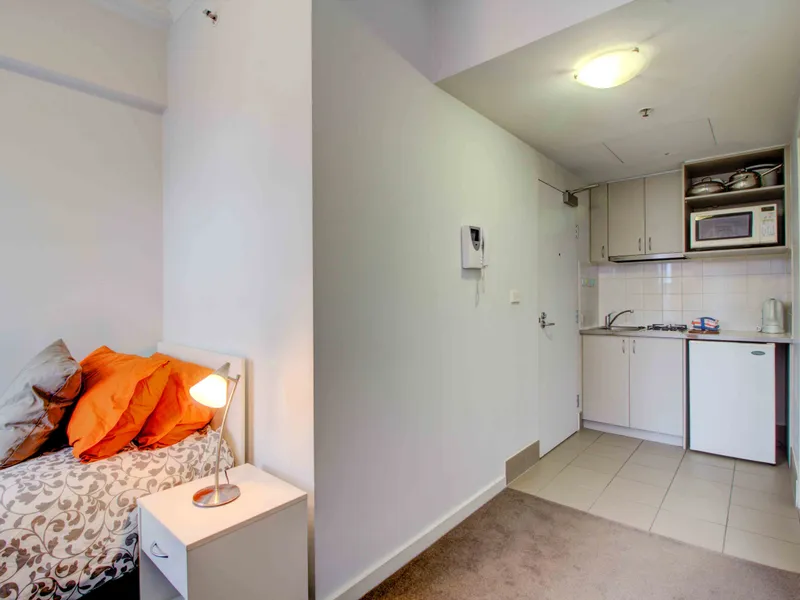 ACCOMMODATION – this apartment comprises open plan bedroom/ loungeroom with split system reverse cycle air conditioning and heating, neat kitchenette, private bathroom and some with a separate balcony and high ceilings. Standard furniture includes single sized bed (including quality inner spring mattress), bed-side table with drawers, study desk and bookshelves, ergonomically designed desk chair, small dining table and two casual chairs, built in robe, quality carpet throughout and LCD LED television.