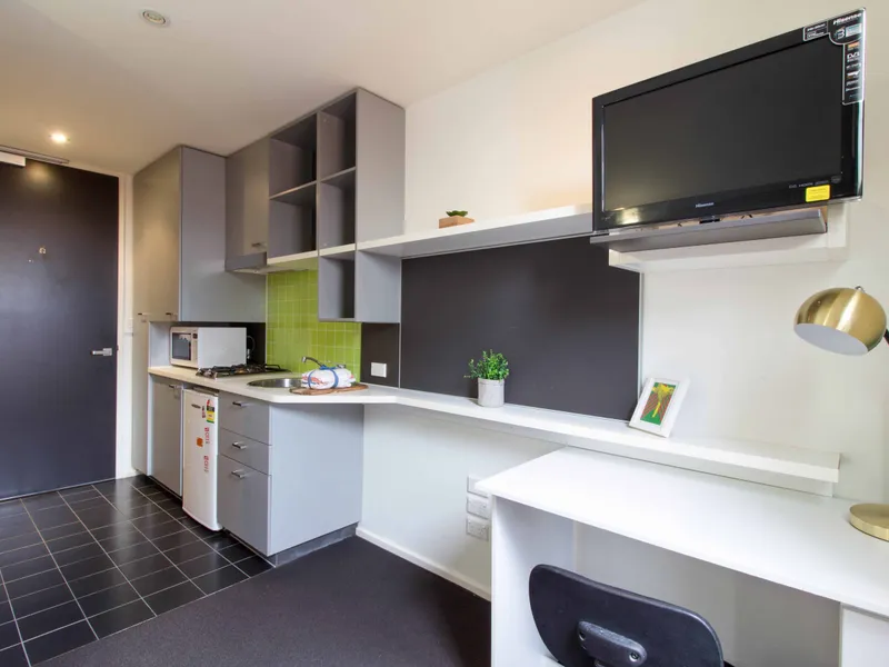 Each apartment features a single bed, study desk, air-conditioning and heating, private kitchen with gas cooking, microwave oven, refrigerator and private bathroom. All apartments come with free-to-air Asian television and gas included in the rent.