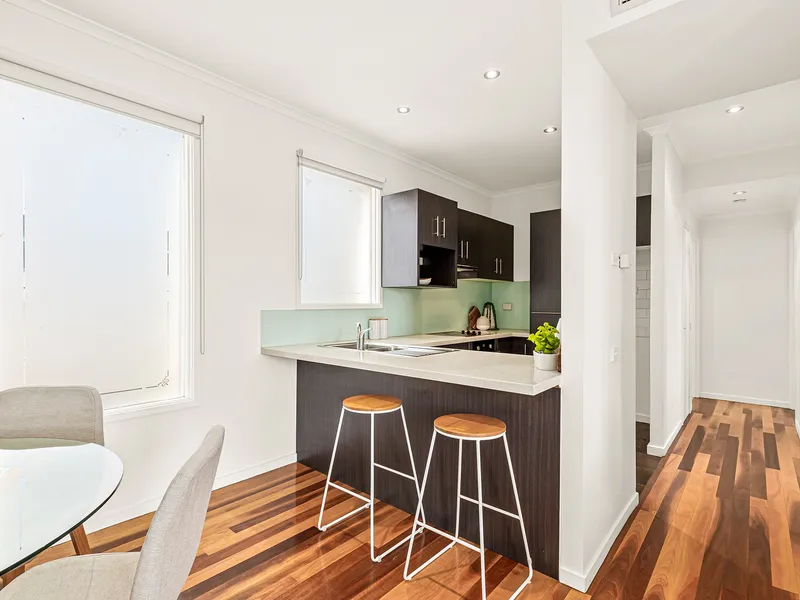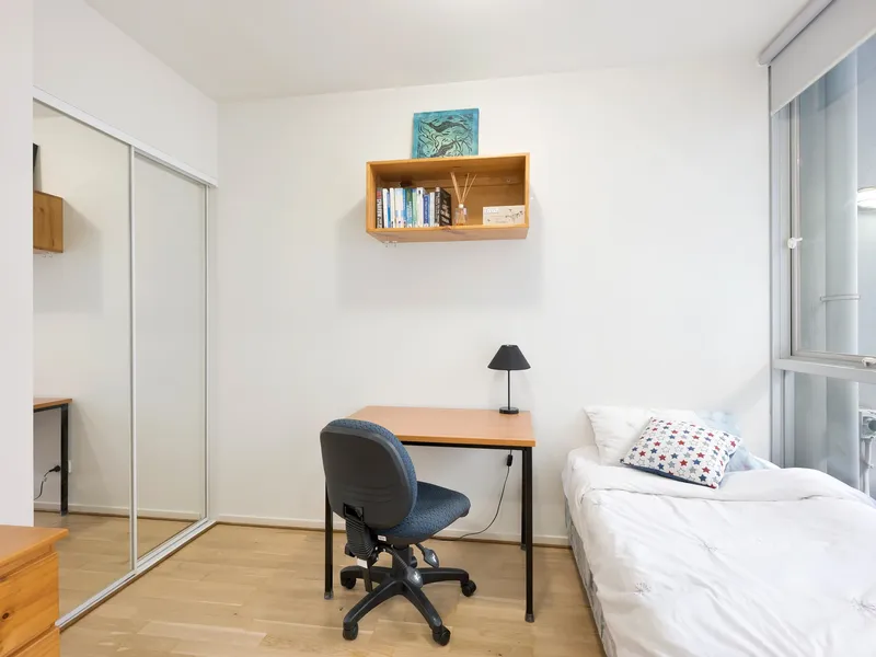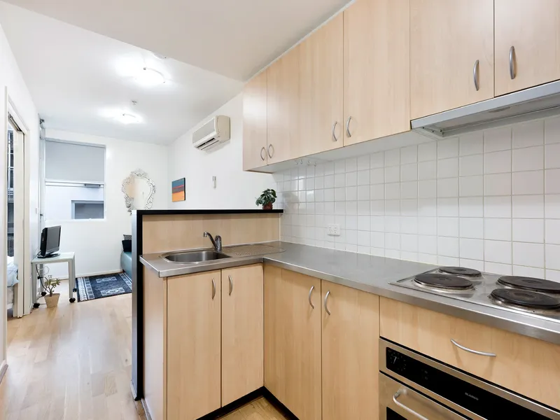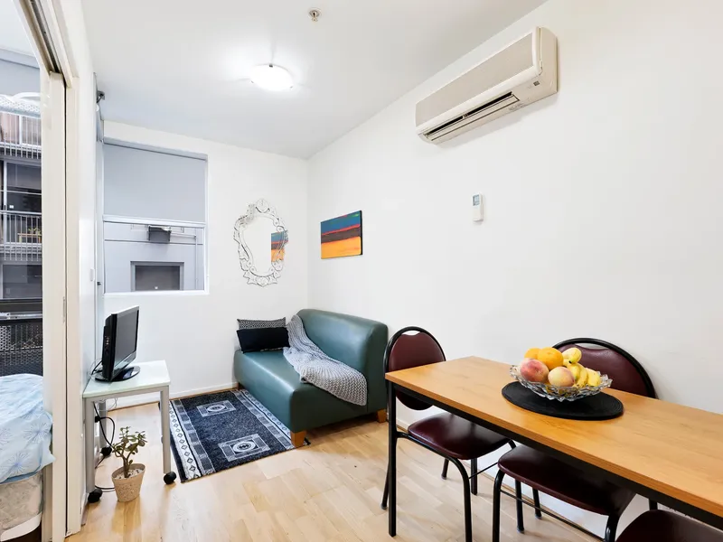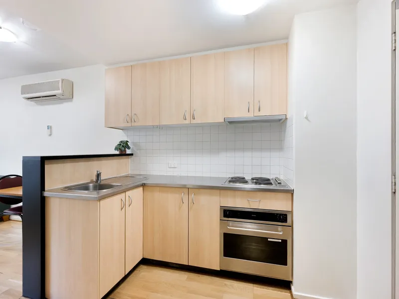 Inside, the apartment features a functional open plan living and dining area filled with natural light, flowing through to a practical kitchen with ample cabinetry, electric cooking, and generous bench space. The layout has been designed for easy living and is ideal for students, professionals, or anyone wanting a low maintenance city base.
