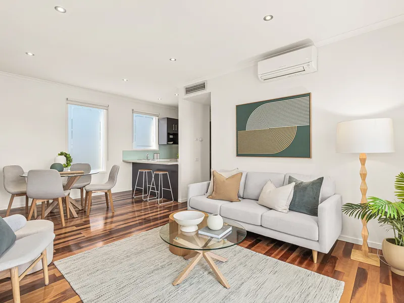 Both bedrooms are well proportioned and come fully furnished, providing a move in ready lifestyle. The central bathroom is modern and well maintained, while split system heating and air conditioning both upstairs and downstairs ensures comfort throughout the year. A private balcony also offers a great place to relax and enjoy the surrounding city atmosphere.