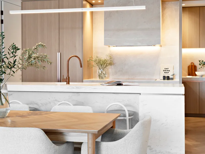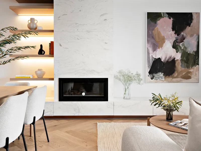 The stunning kitchen enjoys an open plan connection to the dining and living space that leads to a north facing private terrace. The living space enjoys a built in gas fireplace for the cooler months and amazing ambience.
