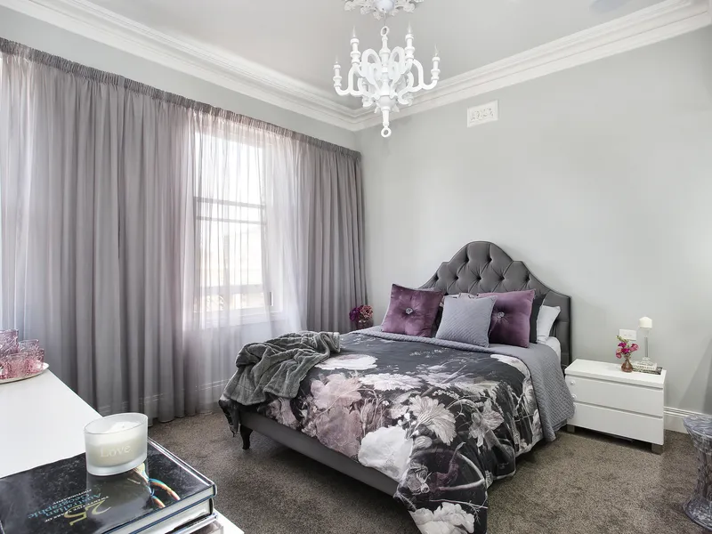 Entry is to a wide hallway with dark wooden floors, which opens into a large dining and lounge space. The dining room has an ornamental open fireplace, and both rooms have ornate Victorian plaster detail. In the centre of the house is a fully renovated kitchen with loads of storage space, walk in pantry and a large stainless steel gas cooker.