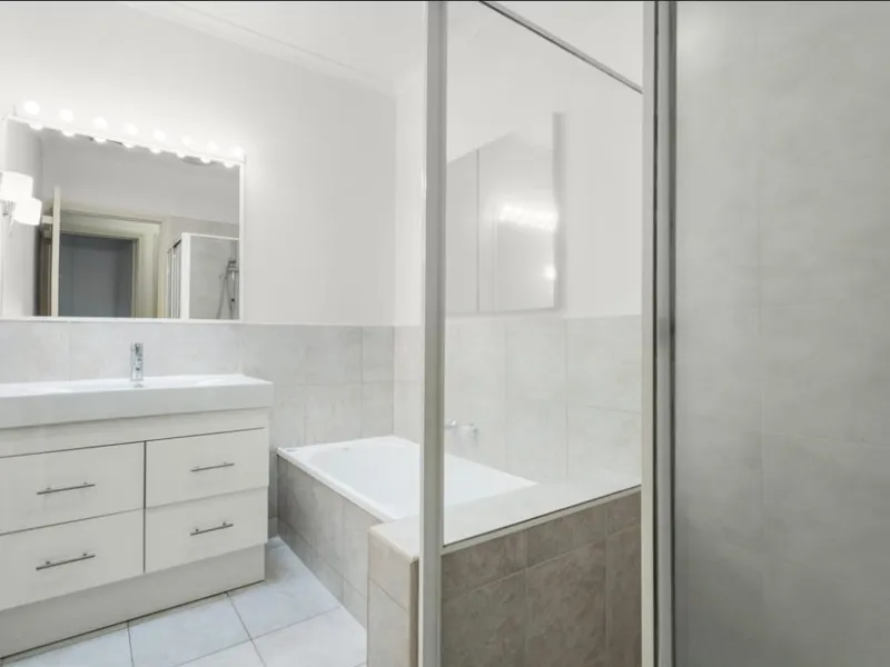 Both bedrooms are generously sized with built-in robes, serviced by a central bathroom with separate bath and shower, plus a separate toilet for added convenience.