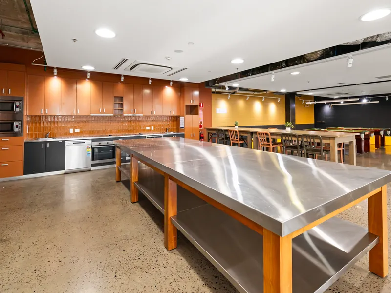 - Communal kitchen with oven, microwaves, dishwashers, and large fridges