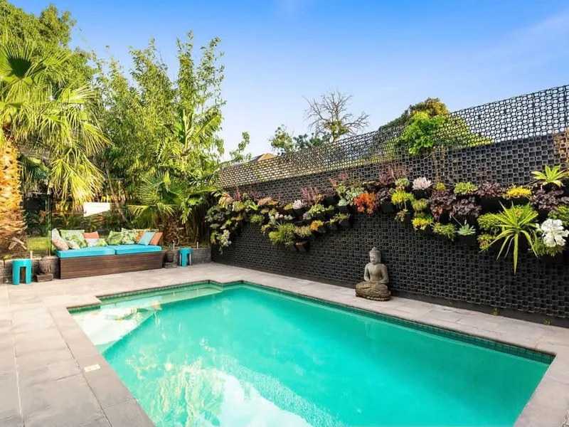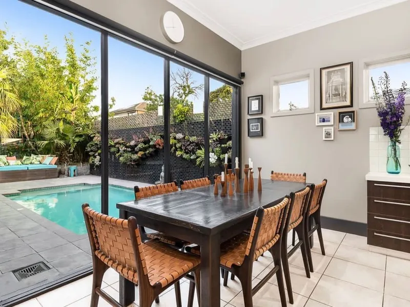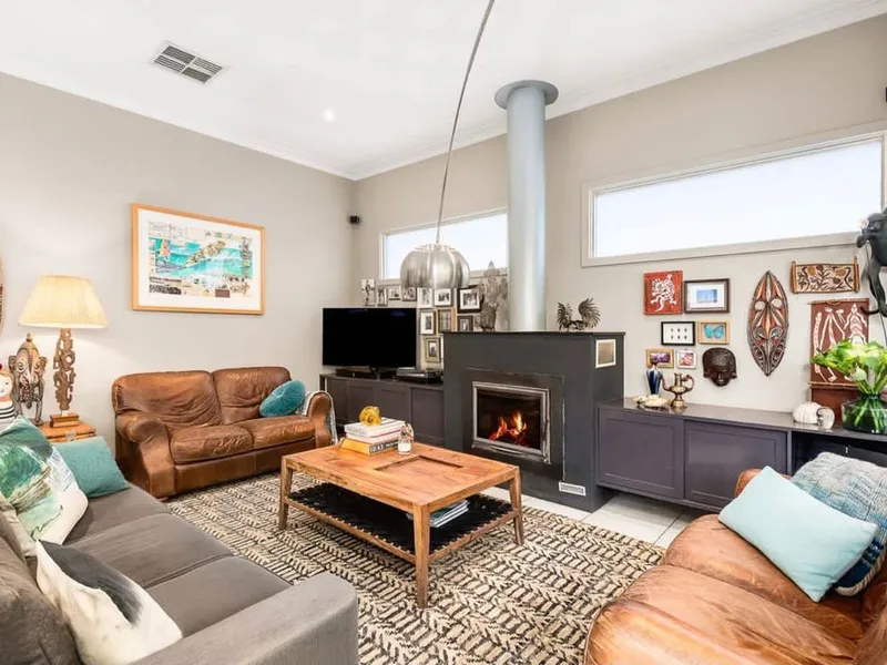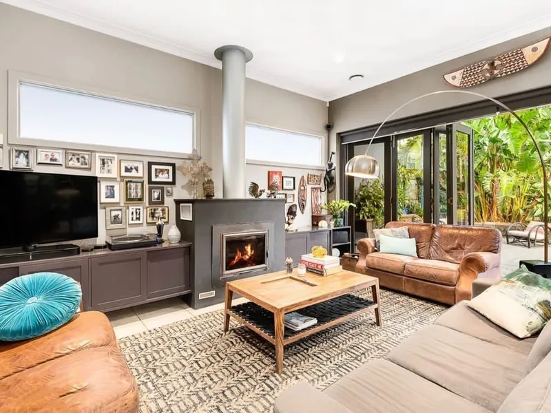 -Light filled open plan living with Coonara fire place and bifold doors out to garden oasis and pool