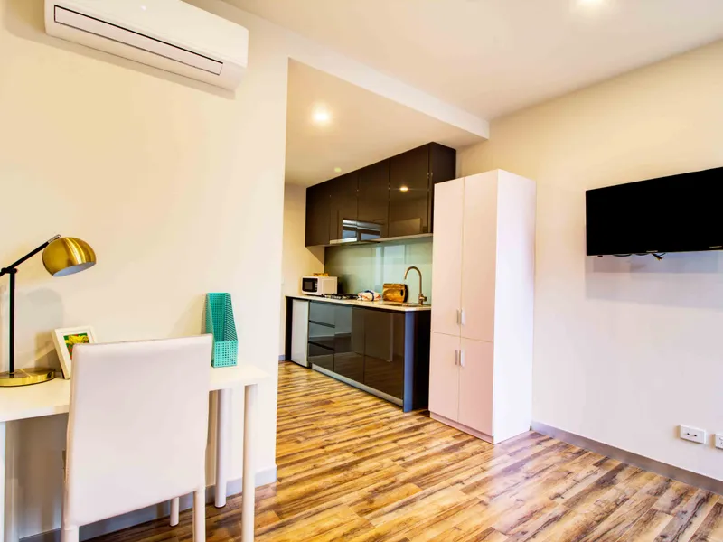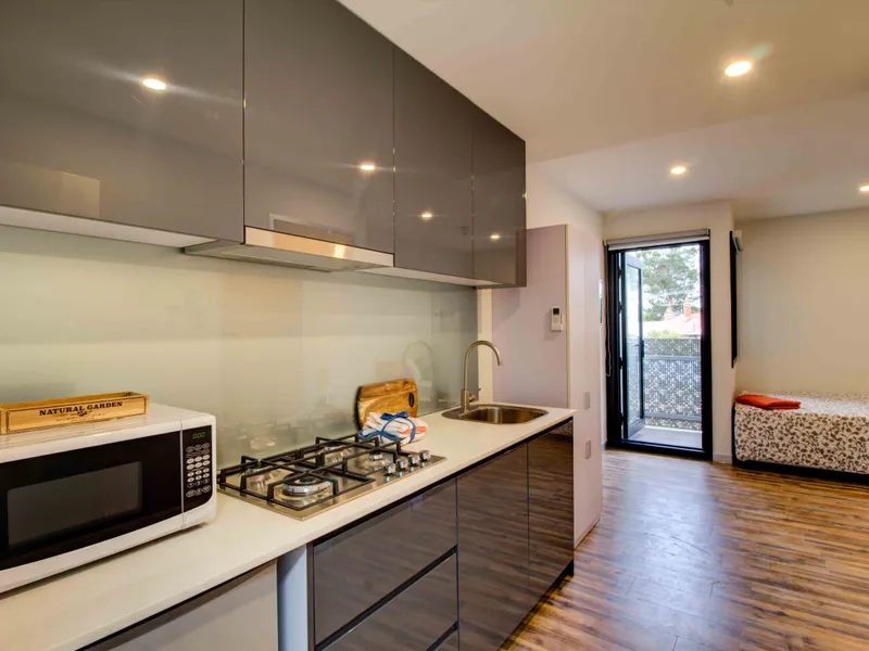Sparkling as new Student Only studio apartments for lease. Partly furnished, most with double beds; study desk & chair. Ultra modern kitchens with stainless steel gas cooking, quality composite stone benchtops and microwave.