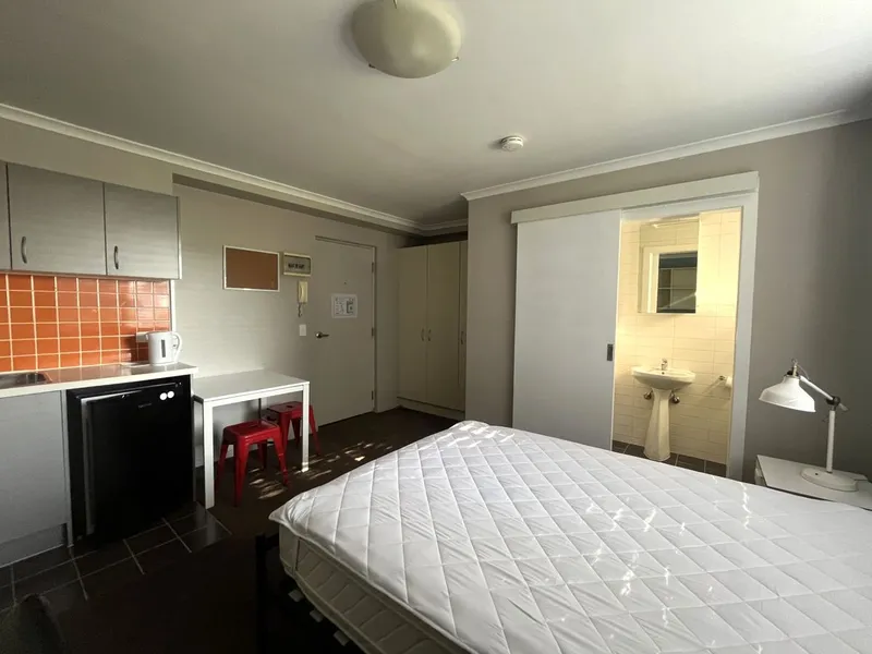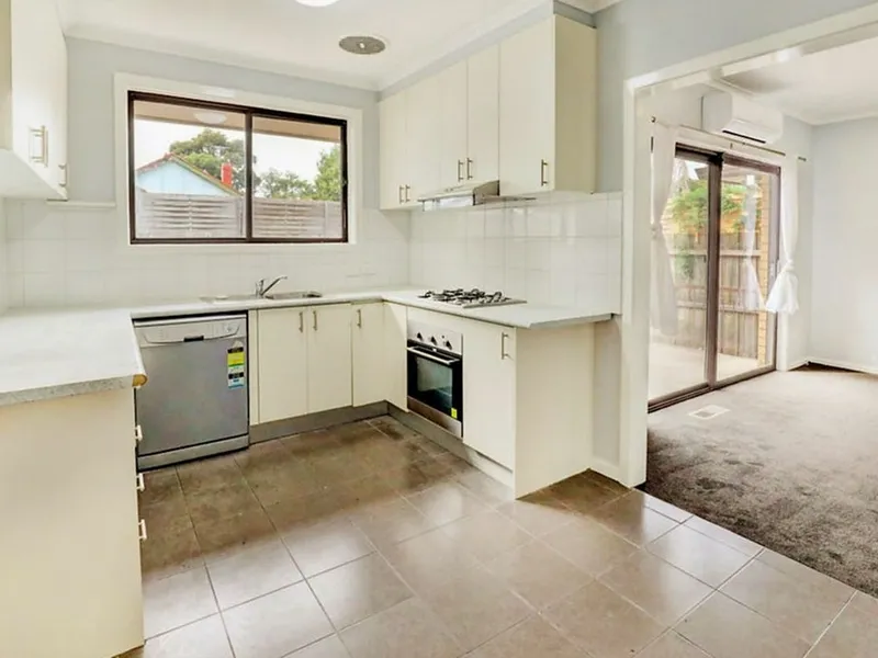 The spacious living/dining area seamlessly flows into a well-appointed kitchen, featuring a gas cooktop, oven, and ample cupboard space—ideal for cooking and entertaining. Both bedrooms come with built-in wardrobes, while the sleek central bathroom provides modern appeal.