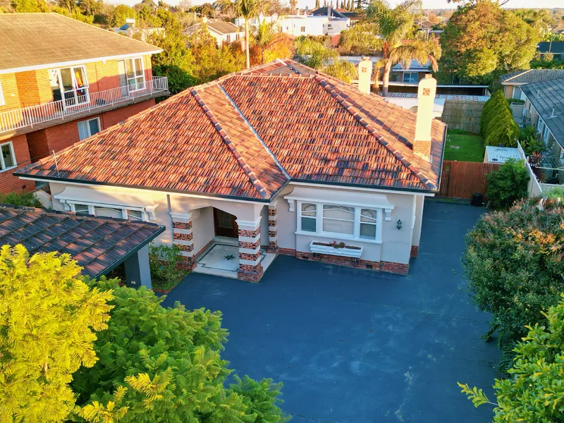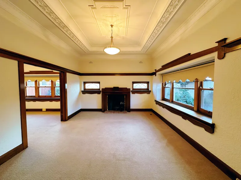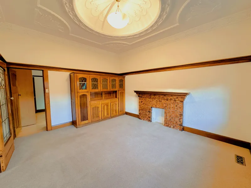 The home presents a traditional stucco facade, a terrazzo porch, and leadlight windows, all providing elegant architectural appeal. Inside, you are welcomed by a broad entrance hall which leads to a tranquil lounge with an inviting open fireplace. This flows onto an elegant dining room, crowned by breathtaking domed plasterwork.