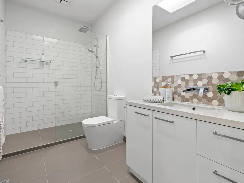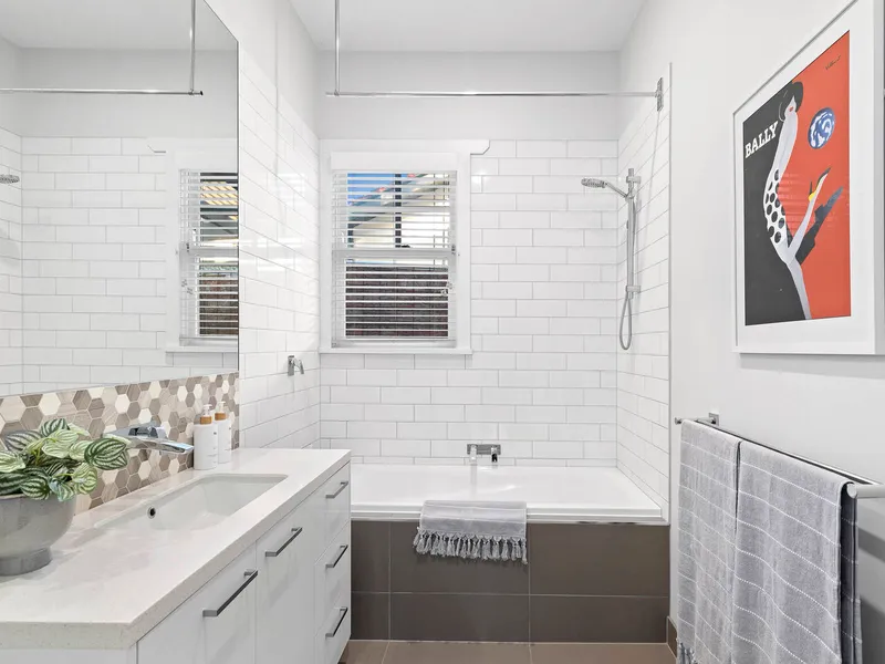 The well-appointed kitchen features stone bench tops and a handy breakfast bar with pendant lighting plus quality stainless steel appliances (Ilve gas cooktop, Bosch oven and dishwasher), space for a wine fridge and soft close, custom cabinetry. Stylish bathrooms reflect the same level of finish flaunting stone vanities, high-end fixtures & fittings and hexagon feature tiles, main with a full size-bath and the en suite boasts a double rain shower.