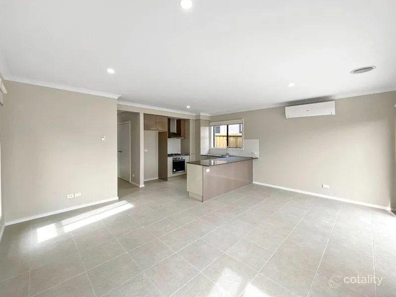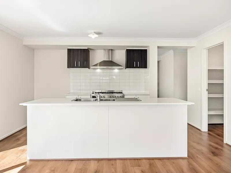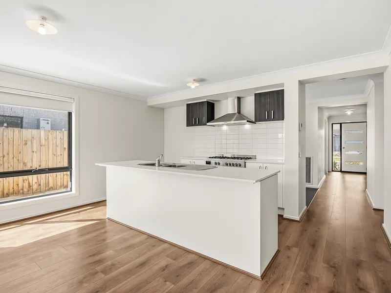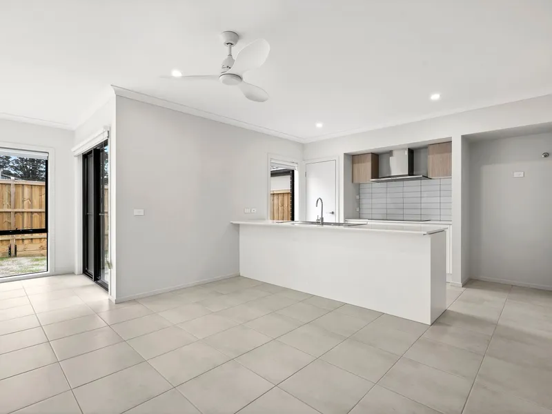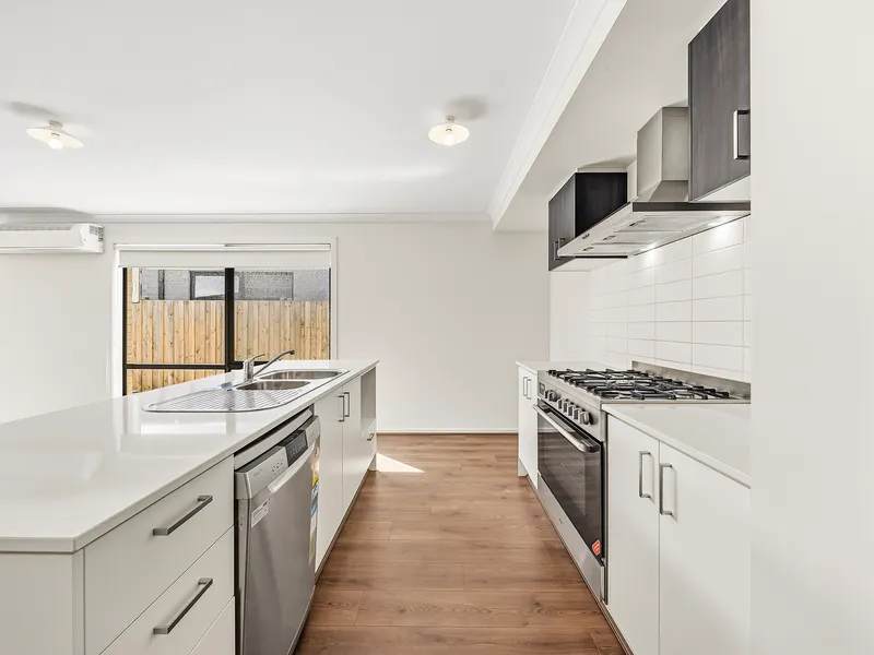 Designed with practical living in mind, the home features a light-filled open-plan kitchen, dining and living area that forms the heart of the home. The modern kitchen is equipped with quality appliances, ample storage and generous bench space – ideal for everyday living and entertaining alike.