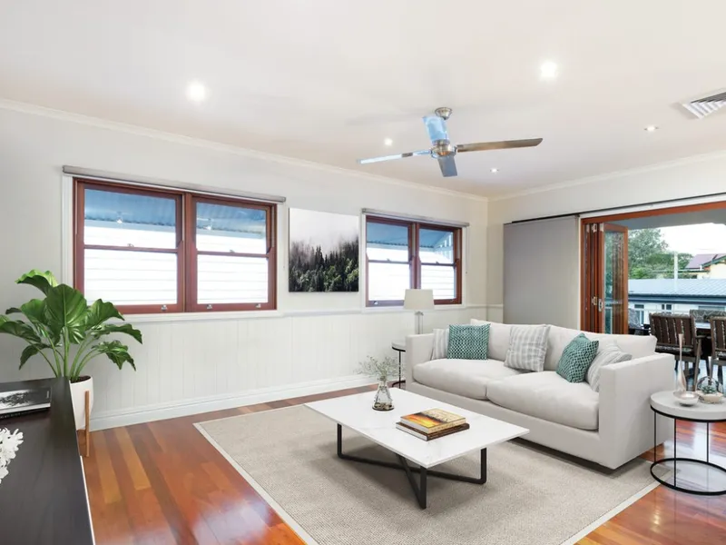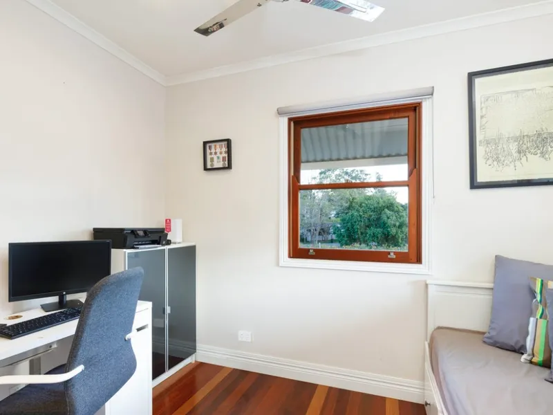 Boasting three generous bedrooms and two well-appointed bathrooms, the home offers multiple living zones designed for both relaxed family living and effortless entertaining. Classic Queenslander features, high ceilings and an abundance of natural light create a warm and welcoming atmosphere throughout. Ducted Air conditioning and ceiling fans ensure year round comfort.