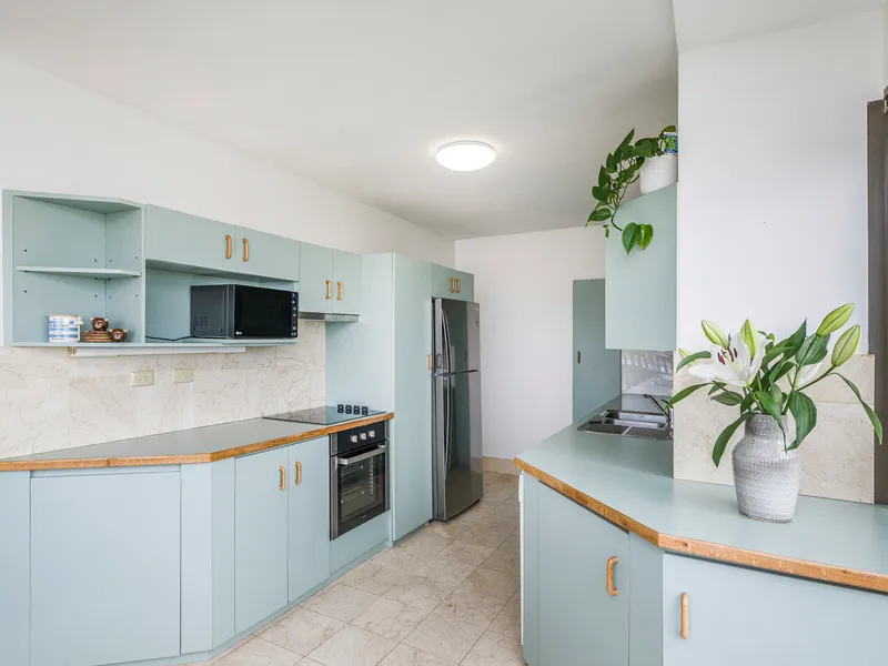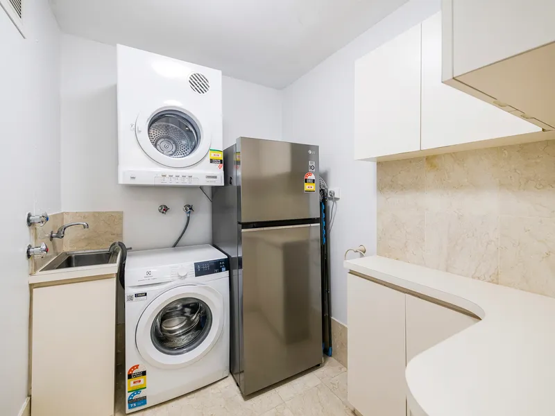 Both bedrooms are generously sized and feature mirrored built-in robes. The large bathroom offers a separate shower, extensive built-in cabinetry and a mirrored medicine cabinet. A full laundry with built-in cupboards and bench space, plus a hallway linen press give plenty of storage options.
