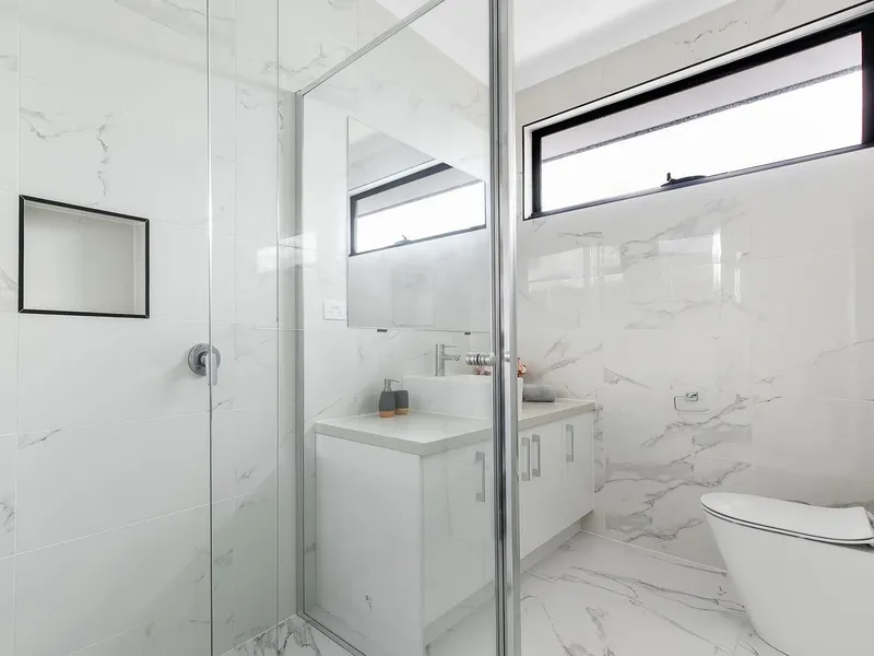 The spacious open-plan living area features engineered oak floorboards and a stunning kitchen with stone benchtops and quality stainless steel appliances, including a 900mm cooktop and rangehood. Outside, you'll find a low-maintenance backyard with paved area plus a grassed area.