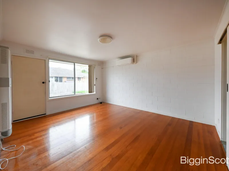 Inside, the home features a spacious lounge room, two generous bedrooms both with built-in robes, and a separate kitchen equipped with gas cooking and ample storage. The large central bathroom adds to the comfort, while polished floorboards throughout create a stylish and low-maintenance living environment.