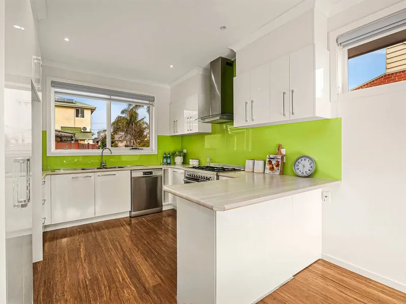 The home features two oversized bedrooms, both fitted with built-in robes, providing generous storage and space. A spacious kitchen is equipped with quality gas appliances and ample cupboard space, perfect for everyday cooking and entertaining. Adjacent to the kitchen, the separate dining area creates a welcoming space for meals with family and friends.