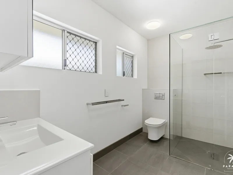 - Fully renovated bathroom and laundry with mirrored cabinetry, vanity, shower, WC and washing machine.