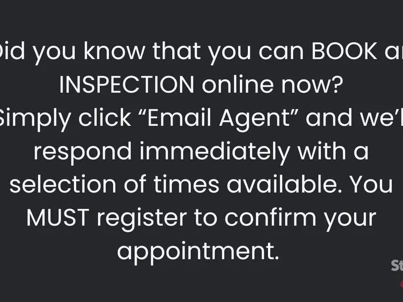 **** BOOK ONLINE NOW TO INSPECT **** Simply click 'EMAIL AGENT' and we'll respond instantly with available appointment times. Register to confirm your chosen inspection times so that we can advise you of any changes or alternatively you can suggest your own time and we will confirm