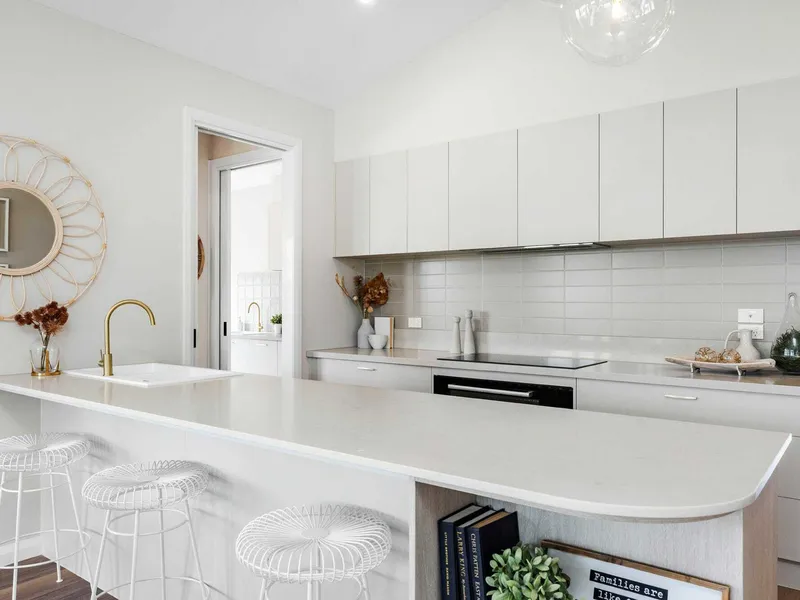 The kitchen boasts a modern look with stone benchtops, light cabinetry induction cooktop and a butler’s pantry, all overlooking the main living and dining area with its gabled ceiling.