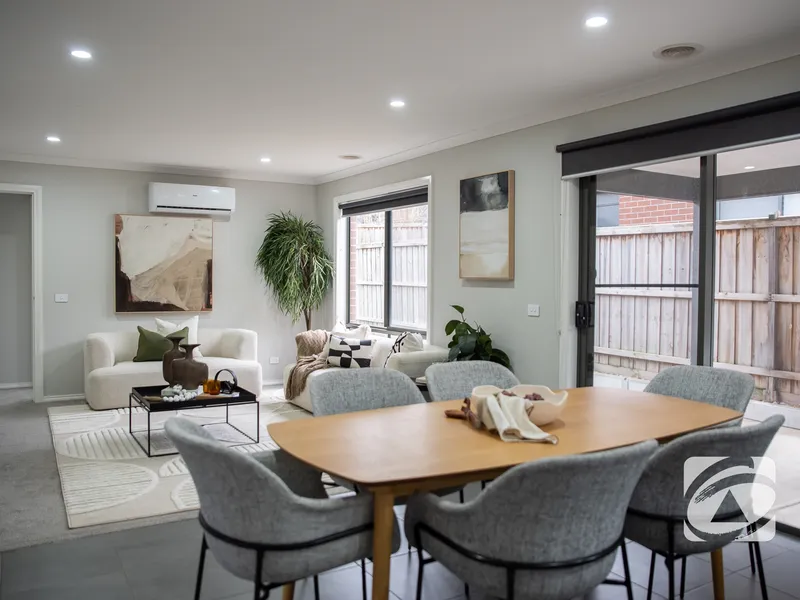 • Open-plan living and dining area filled with natural light, with sliding door access to the outdoor patio
