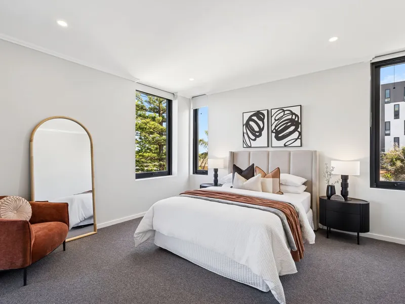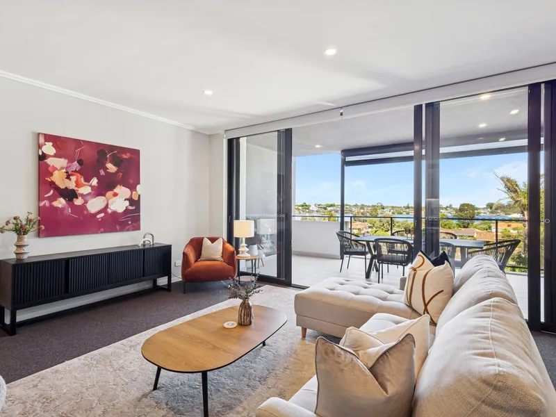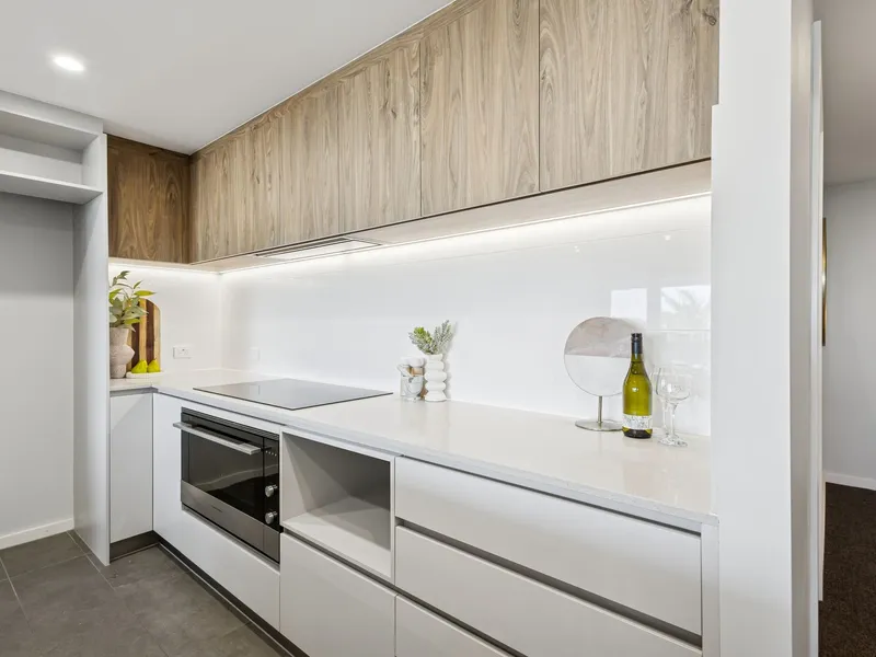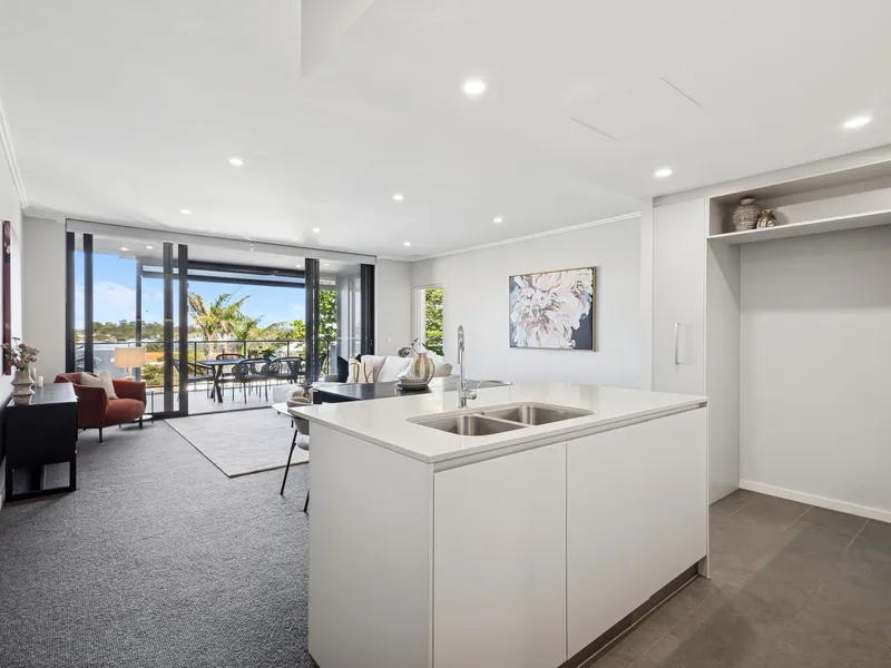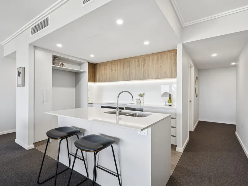 The balcony is generous and faces the river, a natural extension of both the living space and bedrooms. This well-appointed kitchen features stone benchtops, a 90cm oven, plenty of storage space, an induction cooktop and an integrated dishwasher.