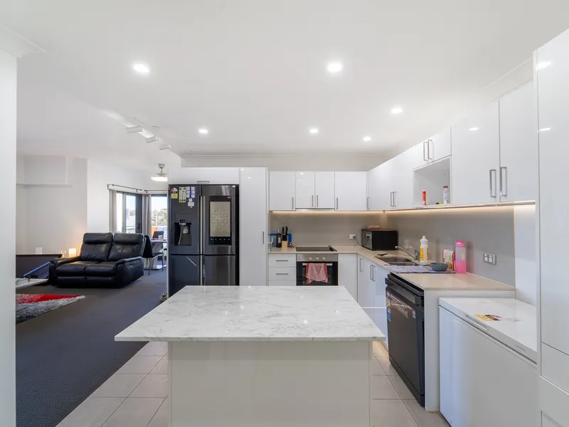 - Modern kitchen with stone benchtops, soft-close cabinetry, 900mm oven, gas stovetop, dishwasher, double fridge recess, microwave recess, large pantry, and breakfast bar