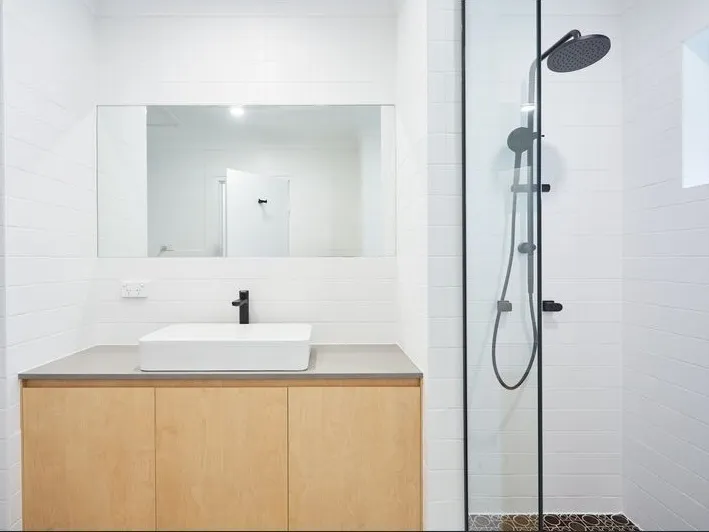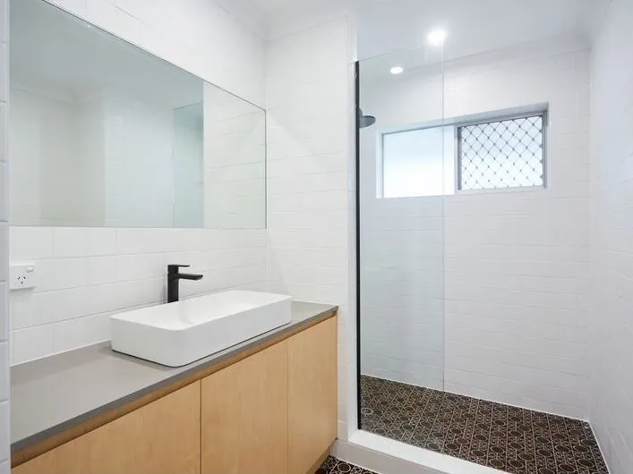 - Spacious renovated bathroom with a decent-sized shower, a large vanity for storage