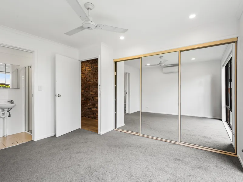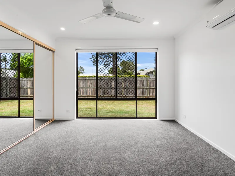 Bedrooms are comfortable, with the master featuring built-in mirrored robes, air conditioning, and garden views. The main bathroom is modern and bright, offering a full bathtub, separate shower, and a large vanity with plenty of storage.