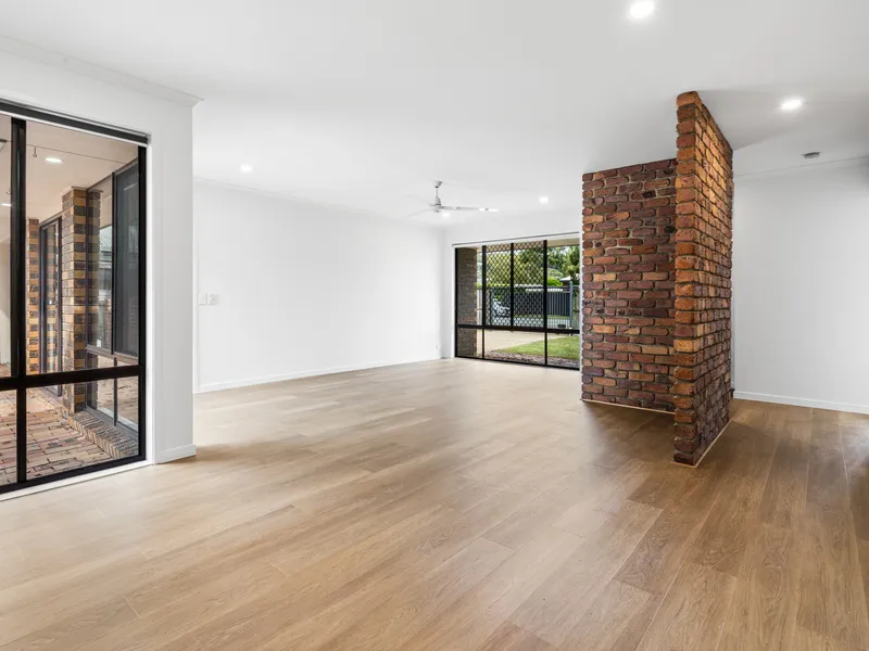 The home's standout feature is its stunning exposed brick archways and feature brick columns, which add warmth and architectural character to the expansive open-plan living and dining areas. Timber-look flooring flows throughout the main living spaces, complemented by high ceilings, ceiling fans and an abundance of natural light streaming in through large windows and sliding doors to the outdoor entertaining areas.