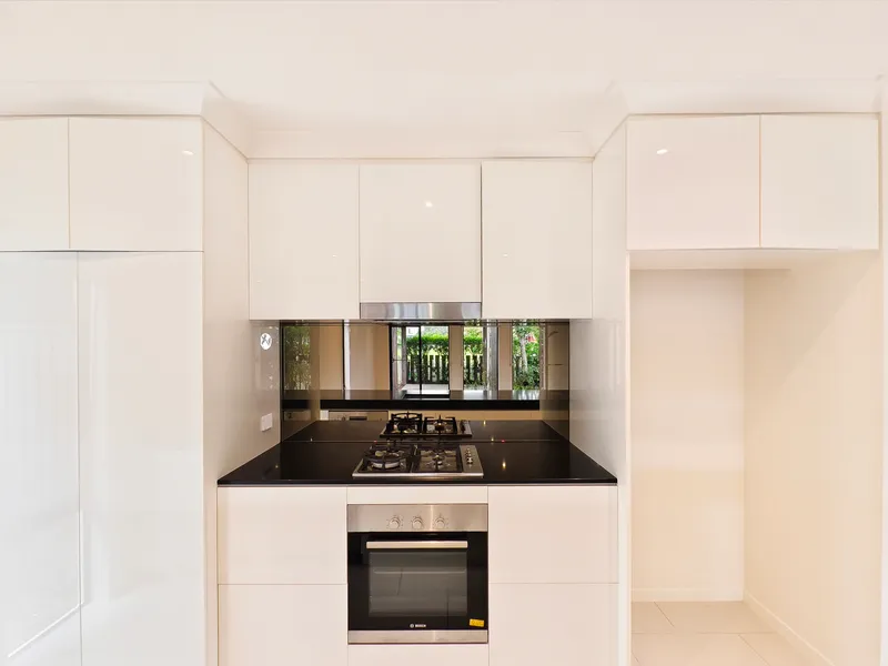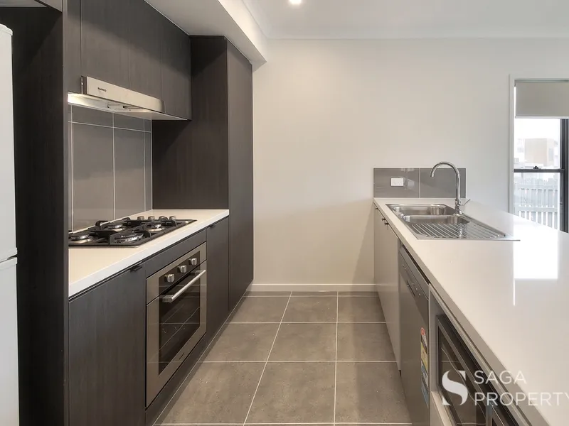 - Modern kitchen with stainless steel appliances including stovetop, oven, rangehood and dishwasher