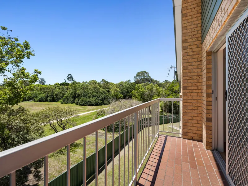 Both bedrooms are generously sized with built in robes and ceiling fans, The master suite is a standout, featuring a private balcony with peaceful parkland views, plus its own esnuite. The main bathroom includes shower over bath, an internal laundry combined with a separate toilet adds extra convenience.