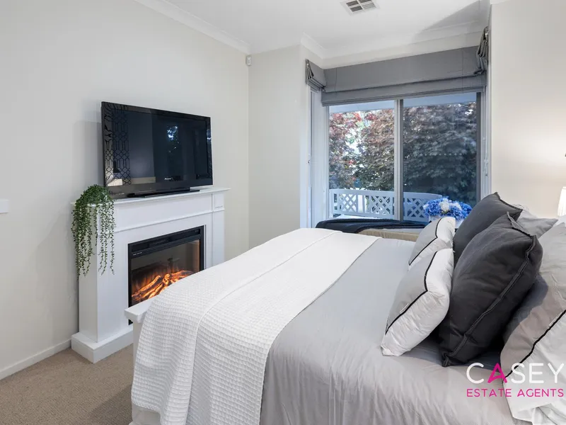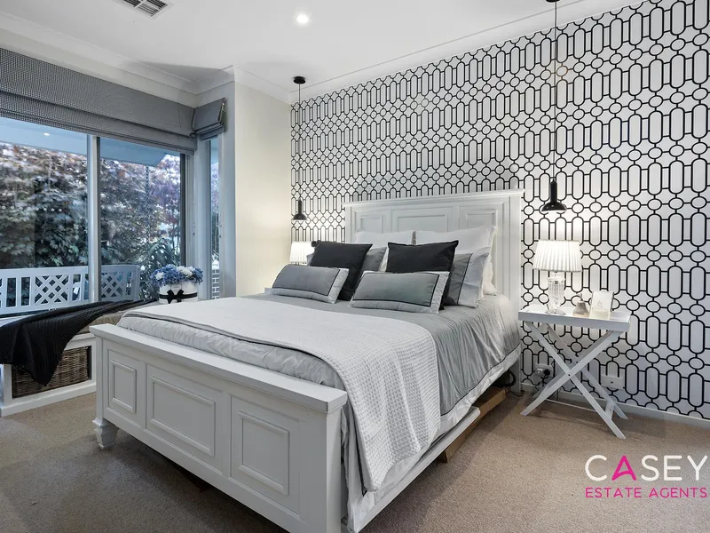 A true sanctuary, the master suite includes a bay window with a cozy seating area, a feature wall with pendant lighting, and a built-in fireplace. The ensuite is elegantly finished with floor-to-ceiling porcelain tiles, stone benchtops, an oversized shower, and a built-in wall niche, all complemented by a spacious walk-in robe.