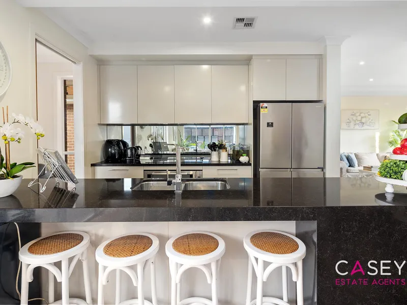 This stunning kitchen is designed for both functionality and style, featuring stone waterfall benchtops, a breakfast bar for casual meals, premium stainless steel appliances, an undermount sink, a walk-in pantry, and a striking glass mirror splashback. Ample cabinetry offers generous storage space to keep the area clutter-free.