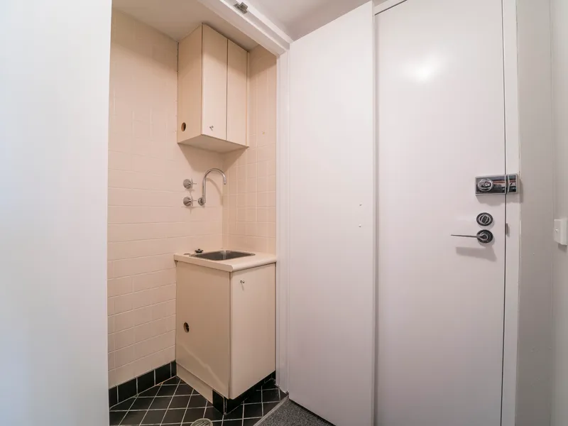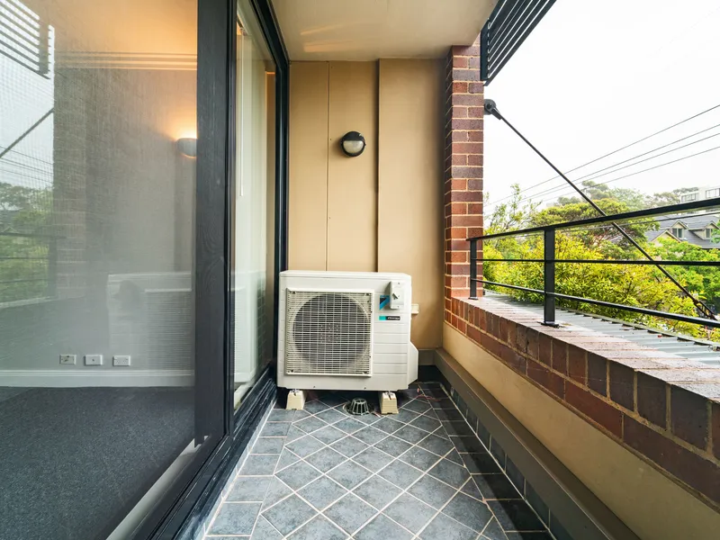 Enjoy a sunny north-facing aspect with large windows and a private balcony overlooking leafy surrounds, creating a peaceful and private retreat. The apartment features a modern gas kitchen with dishwasher and integrated microwave, a generous bedroom with built-in wardrobe, a well-appointed bathroom, and the added convenience of an internal laundry.